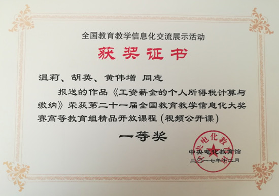12月17日-19日,由教育部指导、中央电化教育馆主办的第二十一届全国教育教学信息化大奖赛在北京举行。广州科技贸易职业学院商贸学院温莉、胡英、黄伟增三位老师的精品视频公开课作品《工资薪金的个人所得税计算与缴纳》荣获本次大奖赛高等教育组精品开放课程(视频公开课)一等奖。
